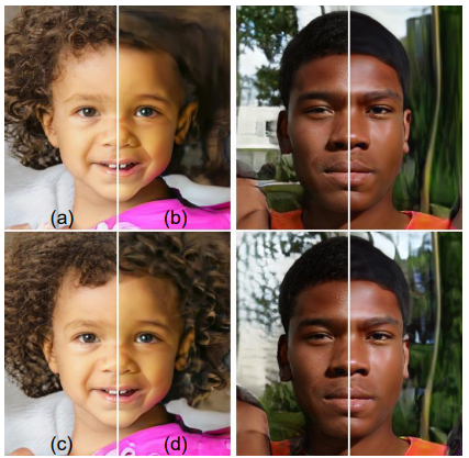 在我们的生成器的不同层的噪声输入的影响。(a)噪音适用于所有层。( b ) 没 有 噪 音 。( c )仅有精细层的噪音(64*64-1024*1024 )。(d)仅粗糙层的噪音(4*4-32*32 )。我们可以看到,人为地忽略噪音会导致无意义的“绘画”外观。粗糙的噪音会导致头发大规模卷曲和出现更大的背景特征,而细微的噪音则会带来更精细的头发卷曲,更细致的背景细节和皮肤毛孔。