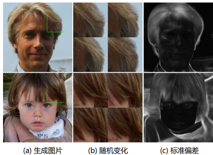 随机变化的例子。(a)两个生成的图像。(b)放大输入噪声的不同实现。虽然整体外观几乎相同,但个别毛发的放置方式却截然不同。(c)100 个不同实现中每个像素的标准偏差,突出显示图像的哪些部分受到噪声的影响。主要区域是头发,轮廓和背景的一部分,但眼睛反射也有有趣的随机变化。身份和姿势等全局方面不受随机变化的影响。