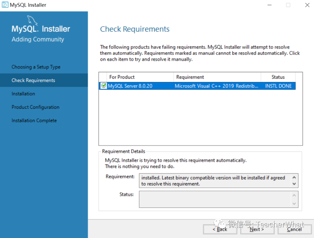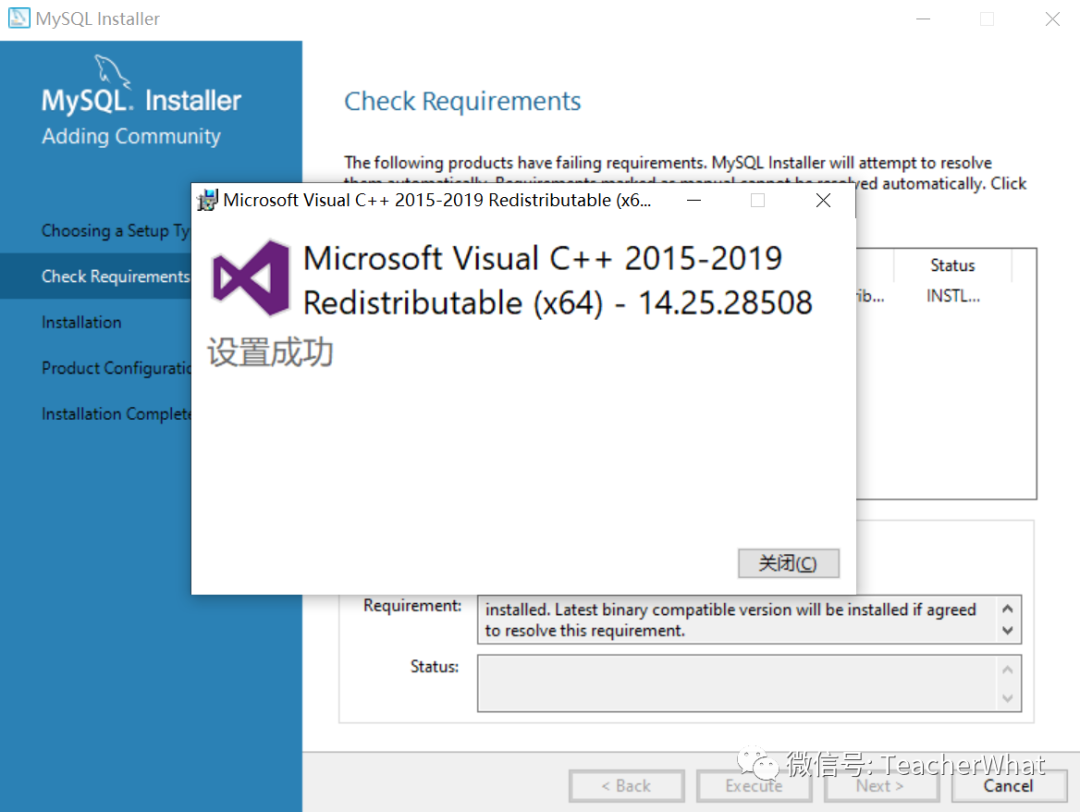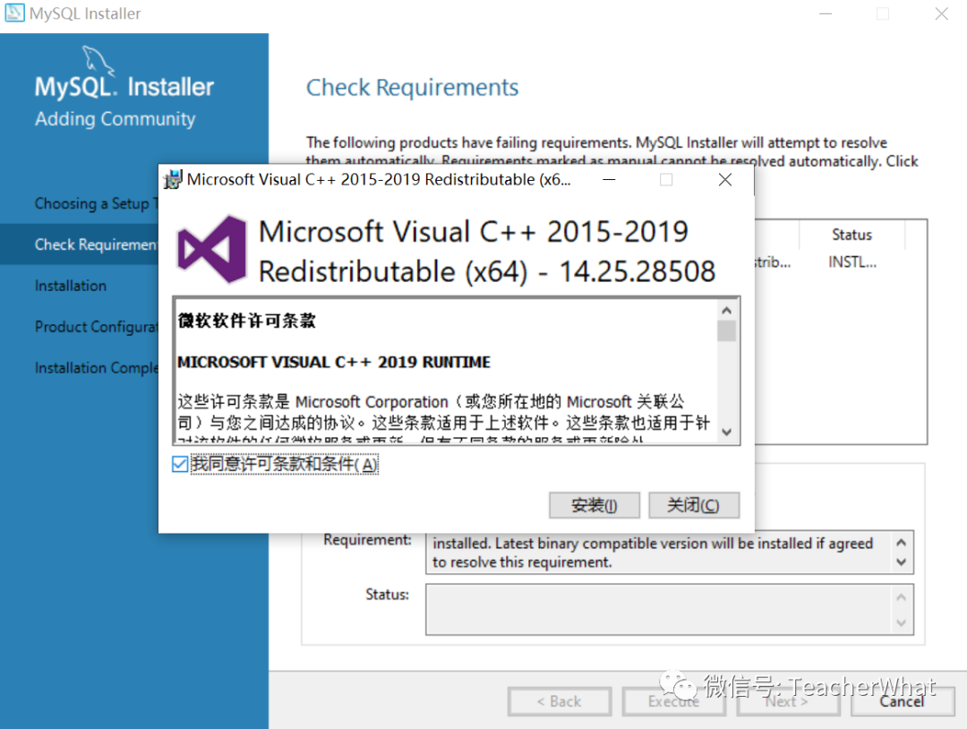 MS Visual C++的安装后,再次进入安装前提检查页面,继续安装MySQL。