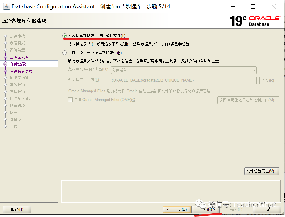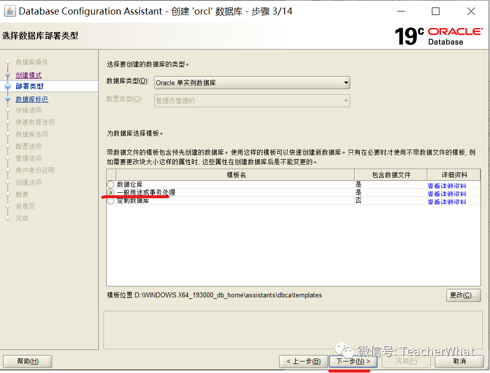 数据库类型选择【Oracle 单实例数据库】、创建模板选择【一般用途或事务处理】,点击【下一步】。
