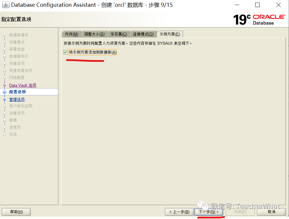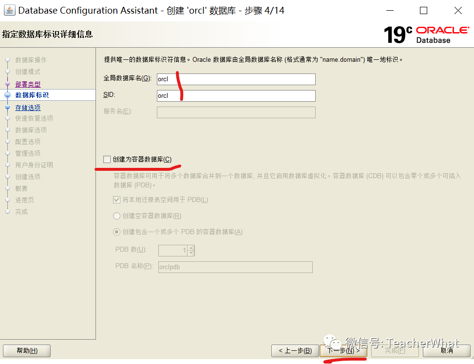 输入SID,为了测试方便取消勾选【创建为容器数据库】(CDB/PDB),点击【下一步】。