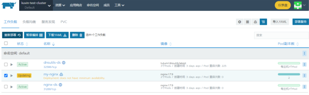 可以看到,这里其实就是简单地创建了角色和角色绑定,然后创建了一个deployment,启动了一个cattle-cluster-agent服务。注意用到了一个镜像