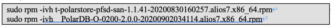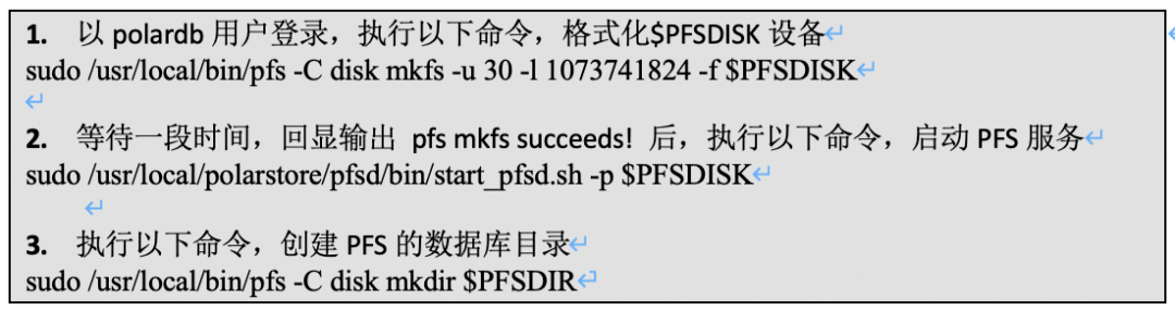 1) 对软硬件环境进行安装配置,请完成第3章节,3.1环境准备、3.2polardb-O数据库软件安装、3.3配置用户环境、3.4配置安装PFS。