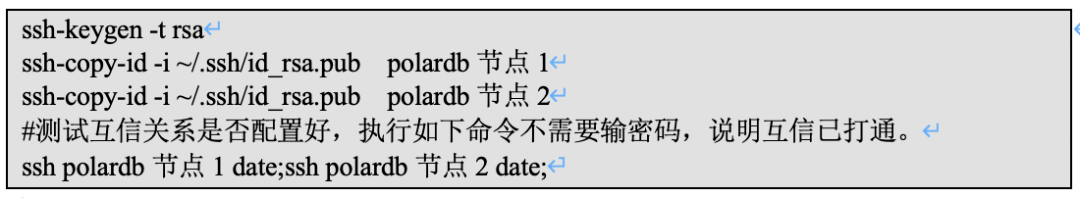 CM需要远程管理主备节点,需要打通CM到主备两台主机之间户型关系。这里统一用polardb用户来建立户信关系,polardb用户执行如下命令: