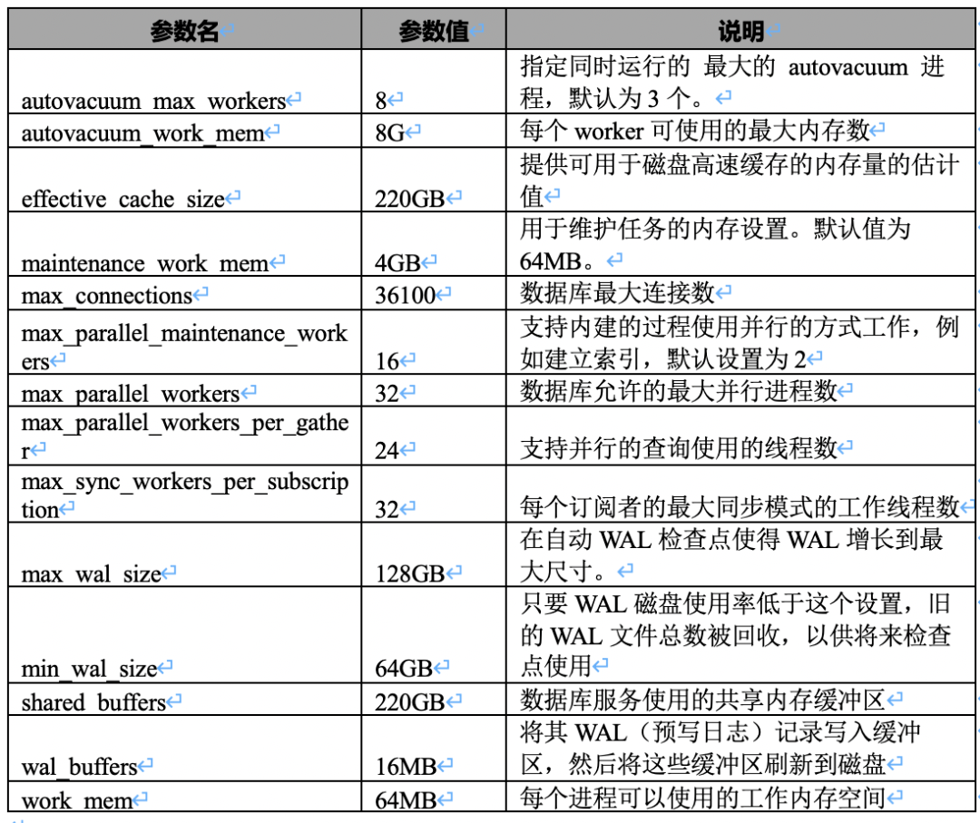 初始化数据库集群后,数据库的参数文件 postgresql.conf 文件中都是默认参数,用户可以根据自身需要进行修改,如下以内存100规格为例,需要修改的核心配置参数如下: