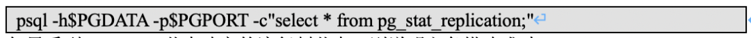 备节点启动之后,可使用psql 连接主节点,检查流复制状态。在主库使用如下sql确认流复制建立成功:
