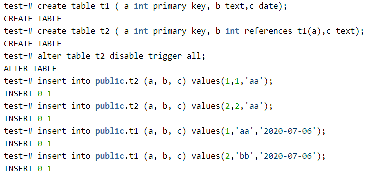 这里数据本身并没有问题,只是当时恢复表数据时候首先恢复了 t2 表导致了违反外键约束的报错,此时我们可以首先禁用 t2 表上的外键约束并在加载对其进行验证。
