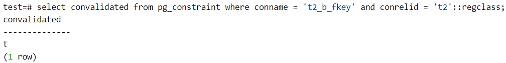 通过查看系统表 pg_constraint,我们可以看到约束记录的状态为已验证。