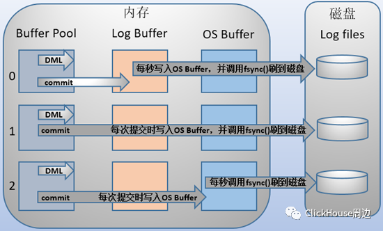 当设置为2的时候,每次提交都仅写入到os buffer,然后是每秒调用fsync()将os buffer中的日志写入到log file on disk。