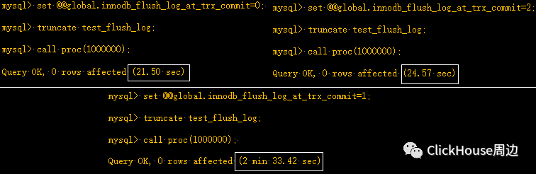 mysql> set @@global.innodb_flush_log_at_trx_commit=1;mysql> truncate test_flush_log;mysql> call proc(1000000);Query OK, 0 rows affected (11.26 sec)