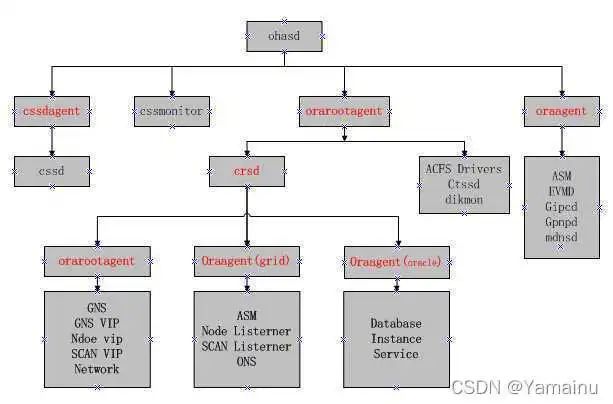 我们看一下上面的这张简化版的GI软件的架构图。我们可以看到CRSD组件主要管理Database,ASM,监听,服务等等应用程序。而各个应用程序又根据所属user不同而被CRSD下面的不同Agent所管理。