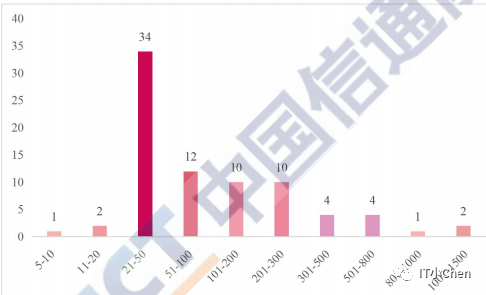 其中 21-50人左右规模企业占比最高,数量 34 个,比例达到 43%,人数在 51-100人左右规模次之,数量为 12 个,占比 15%,101-200 人和 201-300 人规模并列第三,均为 10 个,分别占比 13%,由此可见,我国数据库虽然数量众多,但平均从业人员数量较少,仍在快速发展阶段。