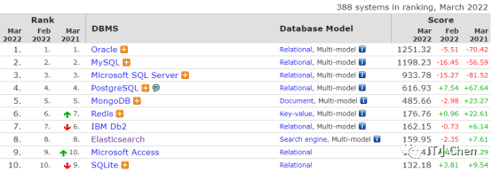 通过db-engines可以看到,前十名排名仍然没有变化,Oracle和MySQL分数越来越接近。
