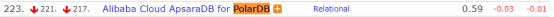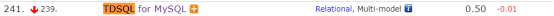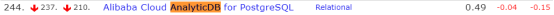 前四名分数均有下降,前十名仍然没有变化,通过热度值可以看到,第一名 TiDB 579.53分,第 10 名 AnalyticDB 198.07 分,第二十名 UXDB 40.01 分。