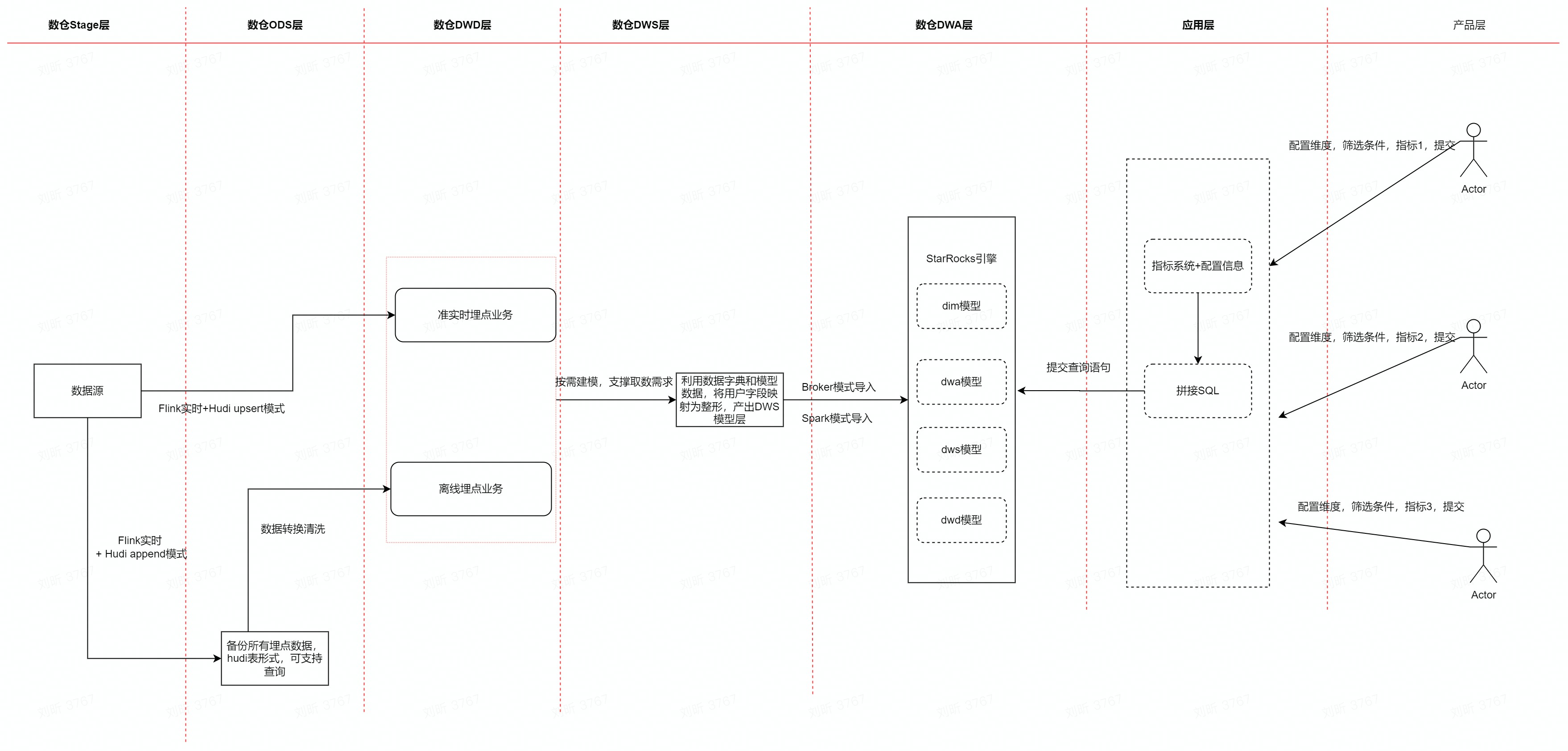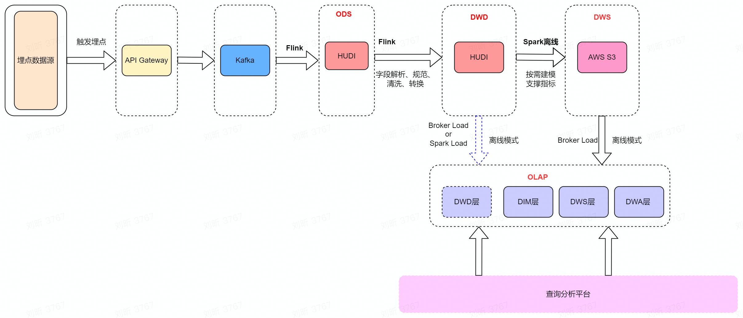 当前埋点数据经由网关转入 Kafka,采用 Hudi on Flink 的模式进行数据清洗、过滤、转换,基于流式数据湖构建 OLAP 的预处理层。根据数据特性和写入的性能要求及成本的权衡,分别基于 Hudi 的 Upsert 和 Append 模式构建 DWD 层(借助 Hudi 的去重、追加能力),定时离线处理数据转入 DWS,考虑数仓的整体架构以及成本优化,将 DWS 数据定时离线导入到 StarRocks 中。最后经由 统一的查询分析平台查询 StarRocks 数据。