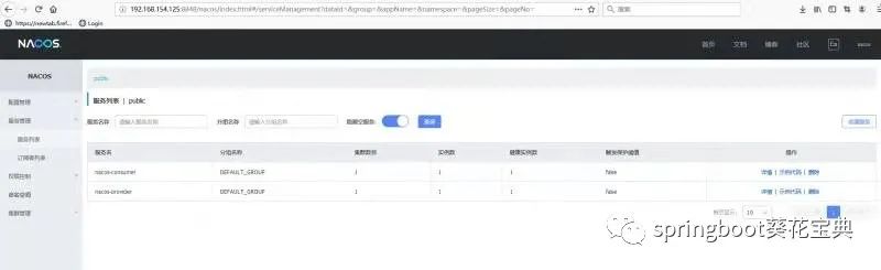 3访问Nacos的UI界面 Nacos服务,内置UI前端界面,使用浏览器,输入http://192.168.154.125/nacos 使用默认的用户nacos/nacos进行登录。注:在生产环境记得修改密码 登录成功界面如下: