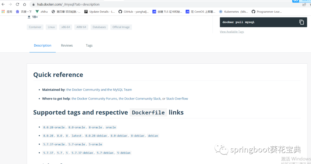 寻找组件镜像,可以在docker hub 寻找所需要的开源组件 查看镜像文档,了解组件的基本配置内容,例如mysql