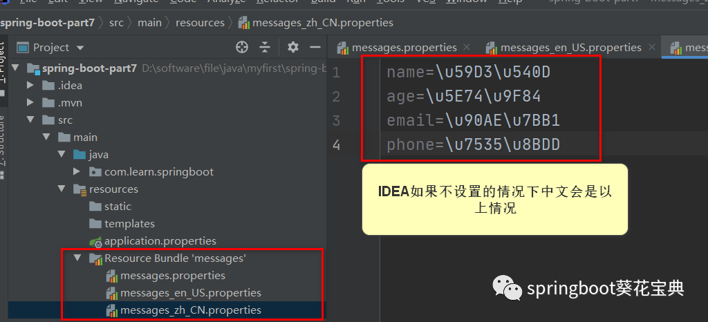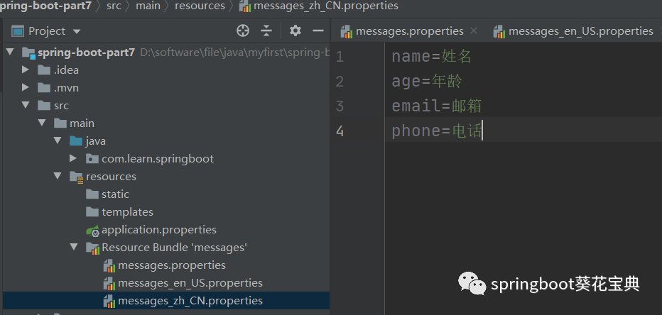 目录下,这个时候IDEA会多显示出一个Resource Bundle,这个大家不用管,千万别手动去创建这个目录。messages.properties 这个是默认的配置,其他的则是不同语言环境下的配置,en_US 是英语(美国),zh_CN 是中文简体。