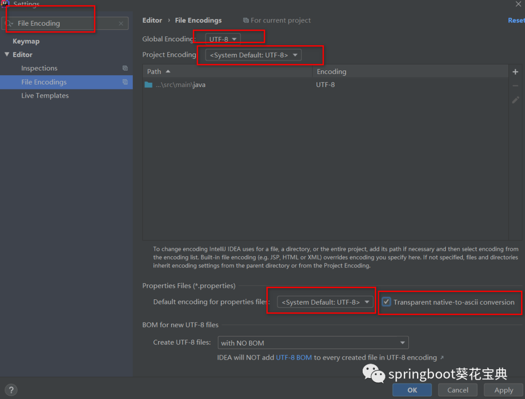 设置方式idea的settings 中输入File Encoding,然后全部设置为UTF-8就可以了。