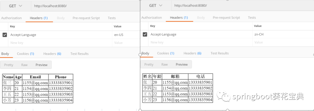 使用POSTMAN,分别在请求的头中设置 Accept-Language 为 zh-CN、en-US,查看结果如下: