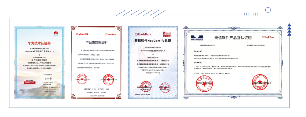 HashData已经完成与国内主流公有云和私有云平台的适配对接工作,并积极参与到信创工作中。2020年底,HashData与华为鲲鹏云实现了兼容性认证;2021年8月,HashData与EasyStack ECF Arm 云基础设施平台完成兼容认证。此后,随着客户在信创环境下的产品需求逐渐增多,HashData陆续完成了麒麟操作系统认证(鲲鹏版+飞腾版)、飞腾芯片兼容性认证、统信操作系统认证(飞腾、腾云、鲲鹏916、鲲鹏920)。
