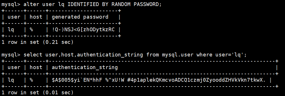 从MySQL 8.0.18开始,CREATE USER、ALTER USER和SET PASSWORD语句具有为用户账户生成随机密码的能力。
