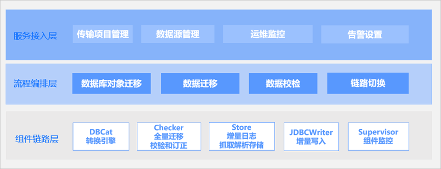 流程编排层主要负责实现上层表结构迁移、启动全量数据迁移、增量数据迁移、数据校检和数据订正,以及链路切换等任务的执行细节。