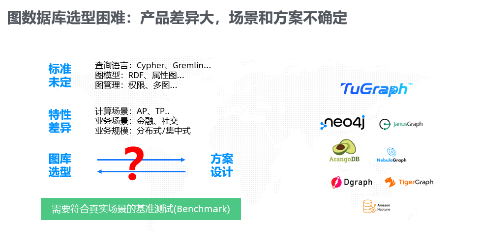 另外一个主要的问题是,图数据库现在很多应用场景其实是偏探索类的,在具体场景当中,会用到哪些算法,需要哪些特性,用户事先并不知道,因此更难选择图数据库的类型。