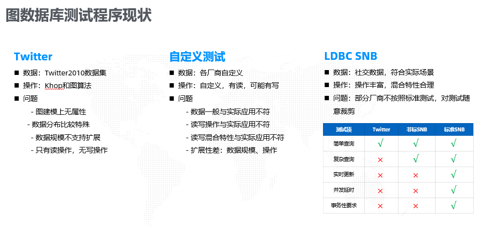 还有一点是标准必须要严谨,这是非常重要的。图数据测试,不能用TPC-C的数据来随意完成,比如只测读不测写,测试的时候把其中所有的写操作都去掉,跑出来一个结果看似很高,实际上却没有意义,因为并不符合实际的测试标准。所以这个标准本身必须要很严谨,它必须有审计规则,要有对数据的验证。