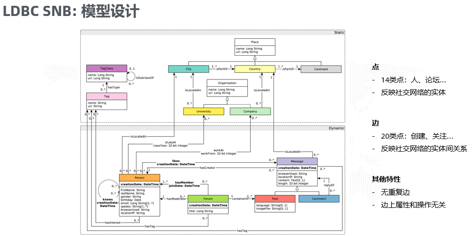 SNB模拟的是一个社交网站的数据,里边有人的节点,有论坛的节点,论坛里边有很多帖子,然后大家可以去转载这些帖子,同时这个人会有各种各样的资料,有他的公司、大学、城市,通过边会把这些信息连起来,在上面去做查询。是一个比较典型的图查询。