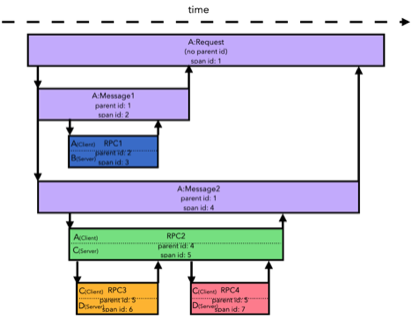 在 Tracing 系统中,主要包含 Trace 和 Span 两个基础概念,下图展示了一个由 Span 构成的 Trace。