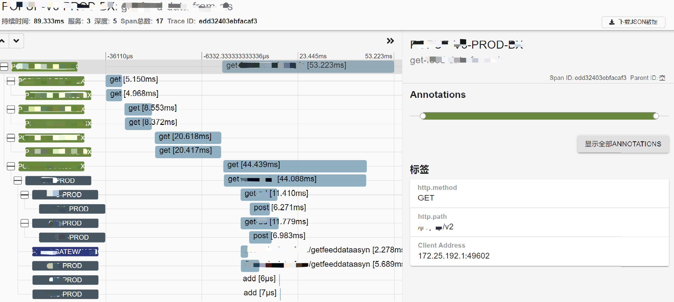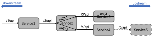 如 Service1 请求的 /2/api 、Service4 请求的 /5/api等,统计查询次数、QPS、耗时百分位数、出错率、超时率等等 Metric 信息。