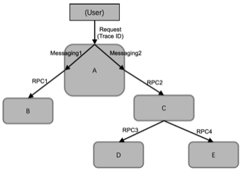 从微服务的角度,Tracing 记录的 Span 信息可以进行各种维度的统计和分析。下图基于 HTTP API 设计的微服务系统为例,用户查询 Service1的 /1/api 接口,Service1 再请求 Service2 的 /2/api,Service2 内部异步并发调用 msg2.1 和 msg2.2,msg2.1 请求 Service3的 /3/api接口,msg2.2 请求 Service4 的 /4/api接口,Service3 内部调用 msg3,Service4 再请求 Service5 的 /5/api,其中 Service5 没有进行 Tracing 埋点,无法采集 Service5 的信息。