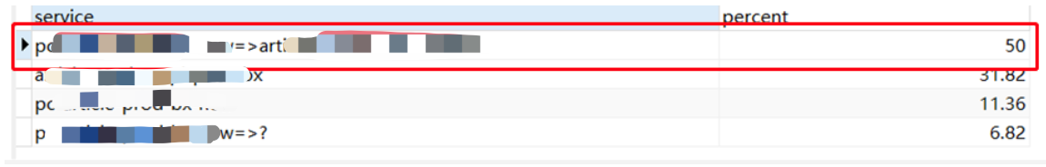 percent descSQL 查询的结果如下图所示,在超时的 Trace 请求中,性能瓶颈服务或服务间调用的比例分布。