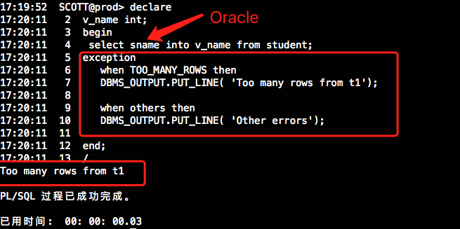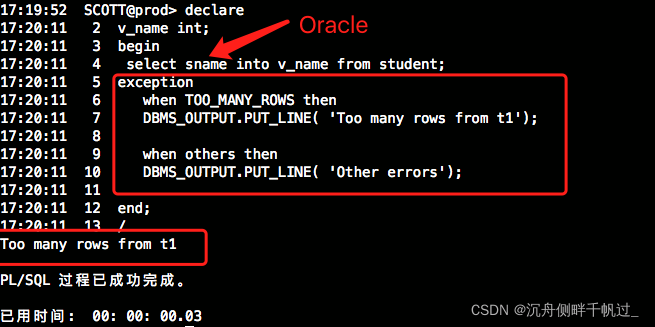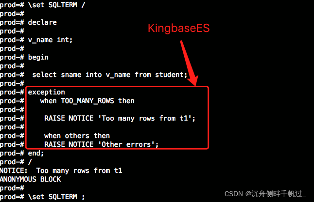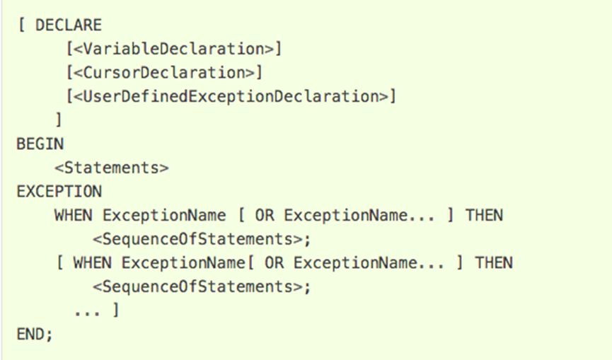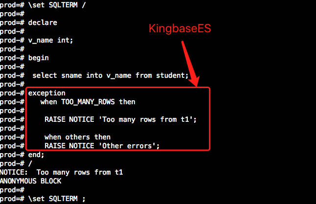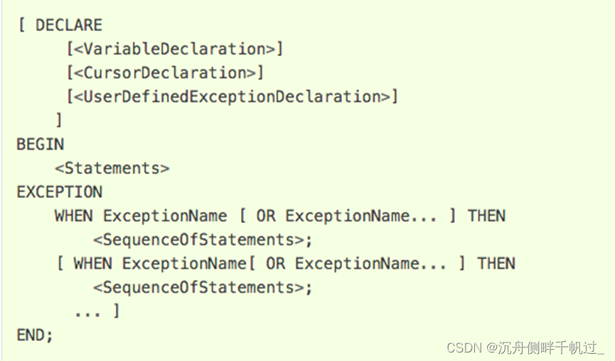 所谓异常处理是指一段用于捕获和处理运行时错误,并被单独封装的 SQL 程序代码。KingbaseES 从语法上支持 Oracle 的大部分系统预定义异常处理功能。此外,KingbaseES 的异常处理方式和 Oracle 也相同,即异常发生后,系统将立即捕获和处理异常。KingaseES的异常处理语法如下所示:
