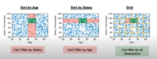假设我们有一张员工表,包含年龄和工资两个属性。当我们需要找出所有年龄在40-50、工资在80K-100K之间的所有员工时,我们可以向数据库发出这样的查询:select [aggregation] from table where Age>=40 and Age<50 and Salary >= 80K and Salary<100K。传统的数据库会通过建立索引来加速这个筛选过程,比如通过在年龄属性上建立索引,我们就可以很快找到所有年龄在40-50之间的员工,之后在该范围内找工资符合查询条件的即可,在工资属性上建立索引类似。然而,当需要筛选的属性数比较多时,需要访问的无效数据(即我们不需要的数据)量也会大大增长,这无疑会降低查询的效率。