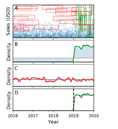 Tsunami通过将划分数据空间来减少查询倾斜,如图 3所示,如果我们以2019年为界将数据空间划分成两部分,我们可以得到如图 5的结果: