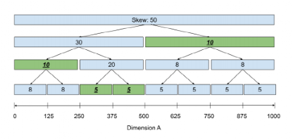 Tsunami采用了一个称为Skew Tree的平衡二叉树来解决这个问题。该树的每个节点代表一段区间的查询倾斜值,除叶节点外,每个节点都有两个子节点。如图 6,根节点代表区间[0, 1000)的查询倾斜值,它的两个叶节点分别代表[0, 500)和[500, 1000)范围内的倾斜值,两个子节点代表的区域是父节点代表的区域通过中点划分而来。在该树上进行动态规划即可得到最优划分值,具体步骤为:从叶节点向上记录每个节点代表的范围所能得到的最小倾斜值,之后从根节点向下找到最小值对应的节点即可。图 7中选择的节点为绿色的节点。根据这些节点就可以确定划分值,图 7中的划分值就是250、375和500。