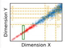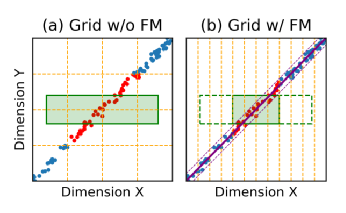 通俗来说,如果两个变量X和Y,X增大时Y单调地增大或减小,X减小时同理,那么我们称它们是相关的。比如出租车收取的费用往往和行驶的里程数相关。在存在数据相关性时,Flood的划分方案会导致各个网格之间的数据量差距较大,如图 8,左上角和右下角的网格里没有任何数据,而右上的网格内数据量较大。