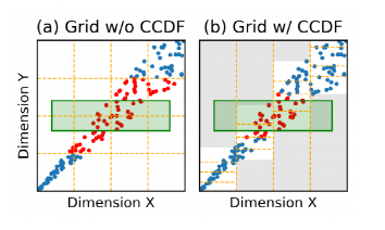 在3)中(即Y依赖于其他维度X划分),Tsunami先均匀划分维度X,然后通过条件累积分布函数condition CDF(Y|X)来均匀划分Y维。如图 10所示,对于划分好的每个X分区,Y的范围不会超出白色范围,故在白色范围内均匀划分Y维度的数据即可,灰色区域由于不存在数据点可以不用建立网格结构。