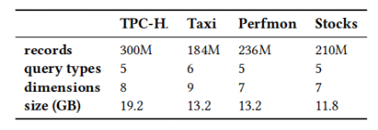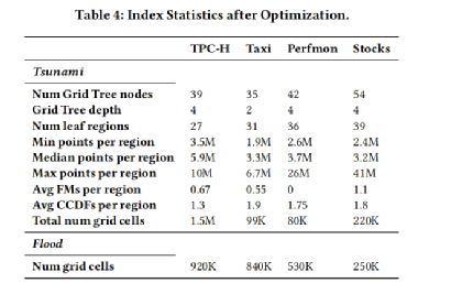 实验首先对比了Tsunami和Flood建立的索引所占用的内存,结果如表 3,可以看出Tsunami建立的索引是轻量级的。