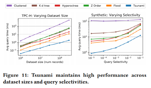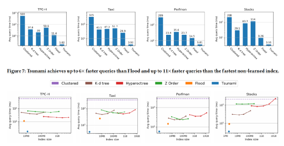 接着实验评估了Tsunami和其它的索引方案在分别处理四类数据集的时间开销和空间开销,结果如图 11所示,可以看出Tsunami查询快且内存友好。