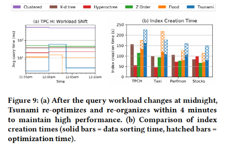 接着实验评估了Tsunami和Flood在查询负载变化时重新调整索引需要的时间,结果如图 12所示,可以看出Tsunami能够很快地响应查询负载的变化。