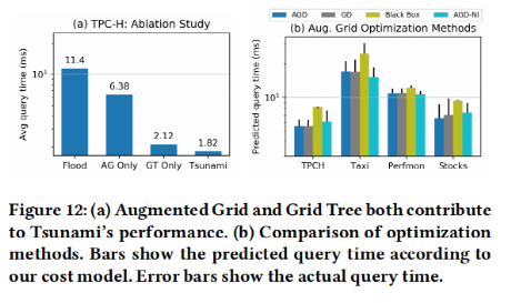 最后,实验评估了Tsunami中提出的每一种算法对于整个系统的影响,结果如图15所示,可以看出论文中提出的算法均有利于提高查询效率。