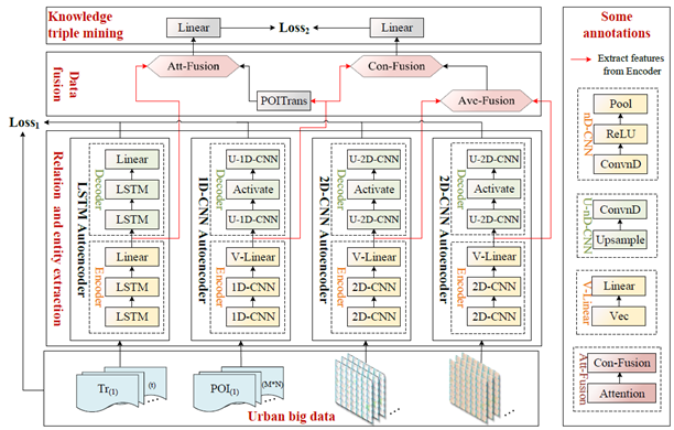 关系提取(R建模,区域流量模式建模):在该部分,我们提取任意两个区域之间流量模式特征作为关系。具体地,由于区域流量模式具有时间特征,因此设计基于LSTM的自编码器来提取交通流量的变化特征。将时间序列流量矩阵输入到LSTM自编码器提取区域之间的两类模式的特征作为这两个区域之间的关系。实体提取(V建模,区域嵌入建模):在该部分,我们通过分析区域之间的可逆关系和不可逆关系来对区域进行嵌入,从而实现实体的提取。由于这两种关系体现出空间特征,我们设计基于2D-CNN自编码器模型来分别提取这两种关系的特征,并将这两种特征的融合结果作为区域的特征,即实体。1.2 城市区域流量模式的知识三元组挖掘(Loss2)数据融合:首先,考虑到POI不具有时空动态性,我们设计1D-CNN自编码器来提取POI特征。然后,我们先对区域/实体的两类特征进行融合,再与POI特征进行连接融合。最后,由于POI特征向量表示每个区域的语义特征,在与区域流量模式/关系进行融合时,我们设计了一个POITrans层将POI特征转化为POI特征变化,再提出基于注意力机制的融合方法将POI特征变化和区域流量模式/关系进行了融合。