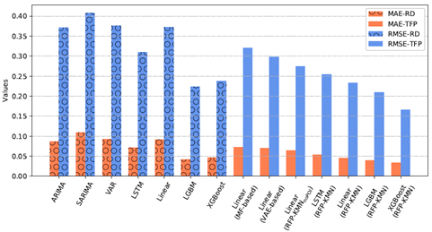 知识三元组挖掘:首先,基于知识三元组随机地替换头实体或尾实体得到伪知识三元组。然后,定义映射矩阵Q将实体映射到关系所在的空间中。最后,基于事实三元组集合与伪知识三元组集合训练映射矩阵Q。我们用成都真实数据集进行实验来验证RFP-KMN框架的有效性。我们通过实体/关系的相似度、链接预测和流量预测(一个城市流量模式的应用实例)来验证提出的方法。对于实体/关系的相似度,我们使用向量的余弦相似度来验证嵌入的性能,相似度越高表明提出方法的性能越好。从表1和表2中可以看出,提出的RFP-KMN具有较好的性能。此外,我们还能得出,区域的嵌入性能会受到POI的影响,且只有部分的流量变化会受到节假日的影响。对于链接预测,高的命中率与低的平均排名都表明提出的方法具有好的性能。链接预测的实验结果如表3所示,实验结果表明提出的RFP-KMN在四个指标上都优于其它基准模型。在流量预测任务中,我们与多种基准方法进行了对比,并以RMSE和MAE作为评估指标。流量预测的结果如图3所示。我们可以得出以下结论:LGBM(RFP-KMN)和XGBoost(RFP-KMN)的预测结果比LGBM(以原始数据为输入)的预测结果更好;与LSTM、Linear、LGBM和XGBoost(这四种方法以原始数据作为输入进行预测)相比,对应的LSTM(RFP-KMN)、Linear(RFP-KMN)、LGBM(RFP-KMN)与XGBoost(RFP-KMN)方法都具有更好的预测结果。