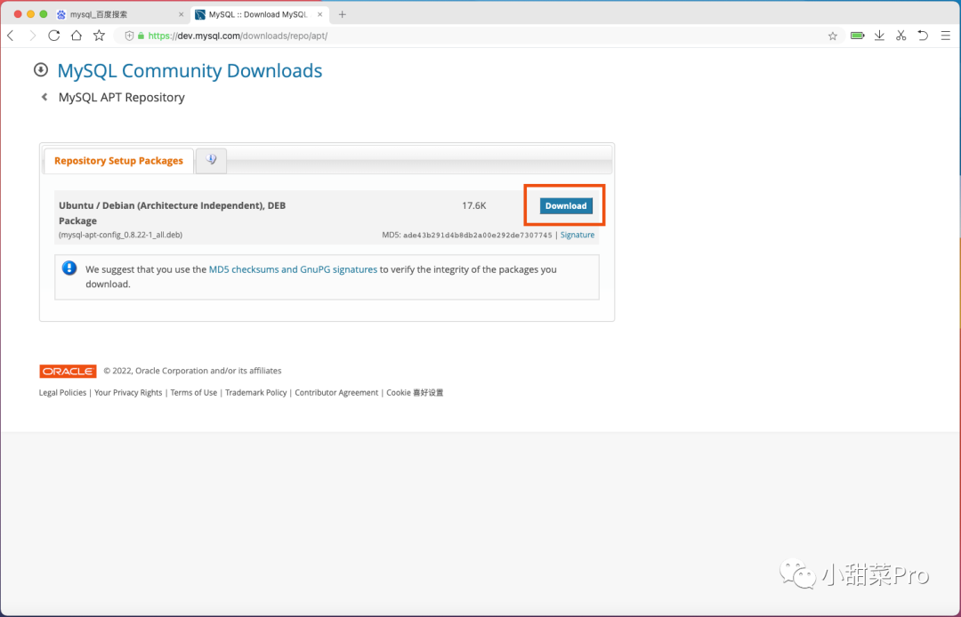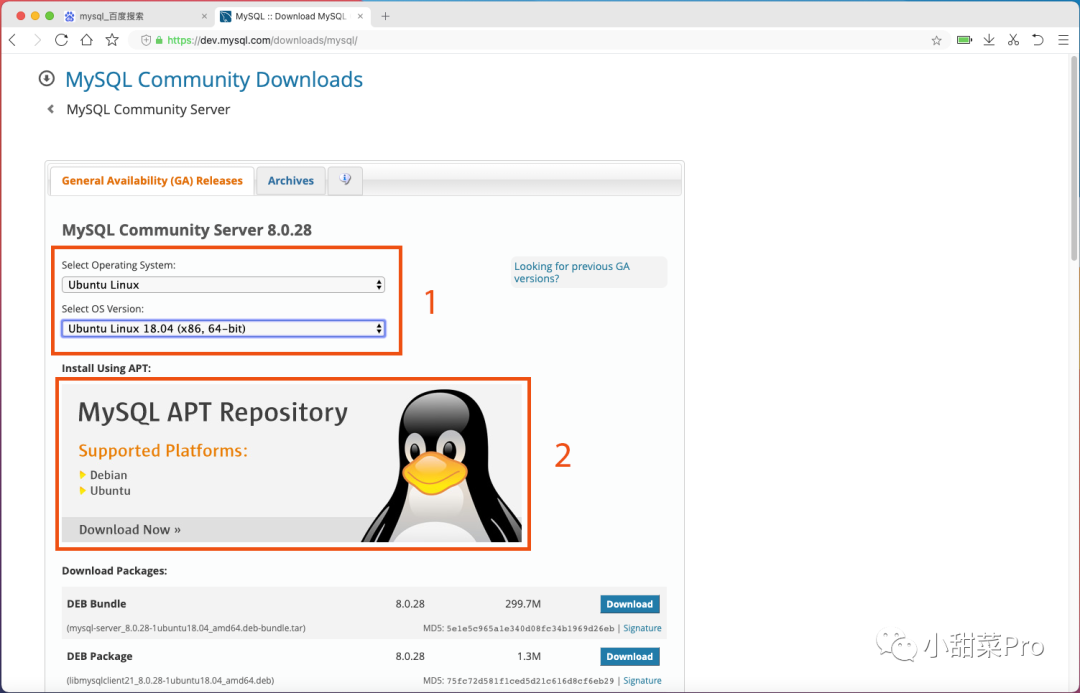 在下载页面中选择自己对应的系统及系统版本,然后点击「 MySQL APT Repository 」