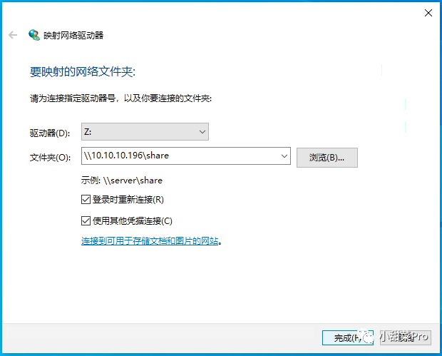 输入「 \\10.10.10.196\share 」,勾选下方的两个复选框,并点击「 完成 」