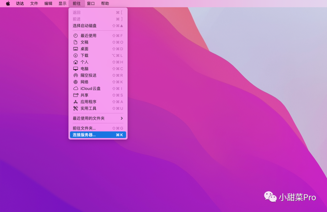 点击「 访达 」中的「 前往 」并找到「 连接服务器 」