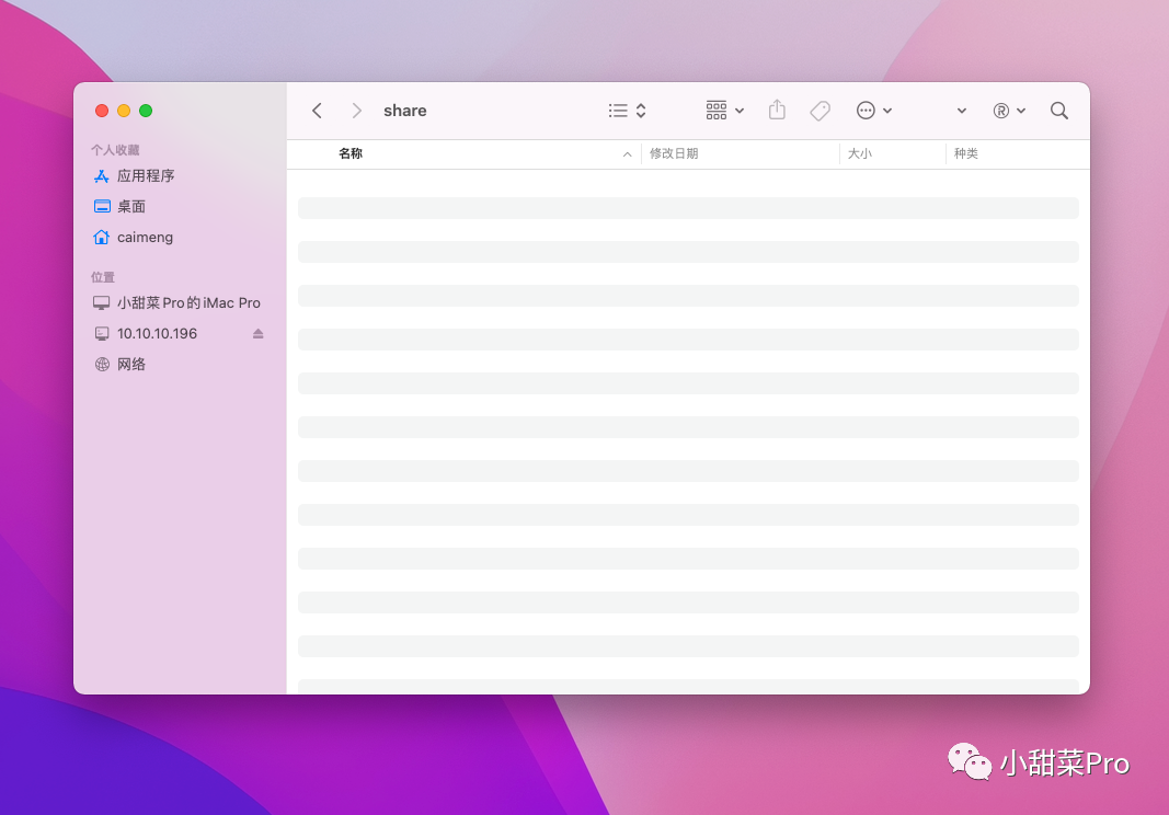 点击「 连接 」后就会进入Samba网络文件系统,在访达的边栏中会多出一个网络磁盘